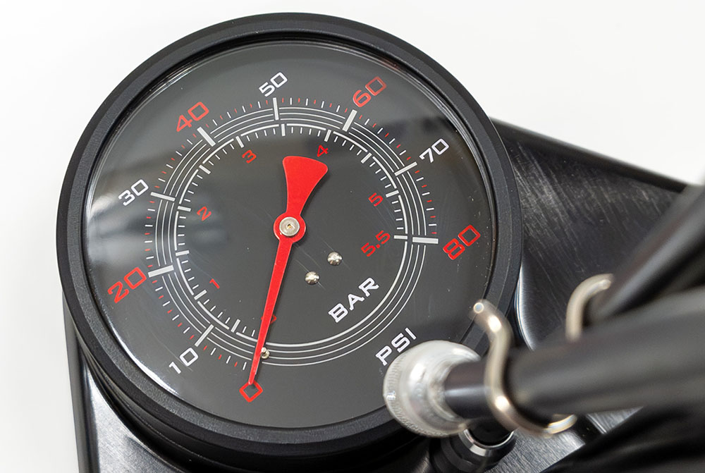 直径4インチの大きな圧力ゲージを採用し、空気圧の確認が非常に容易です。最大80psi(5.5bar)まで対応しています。