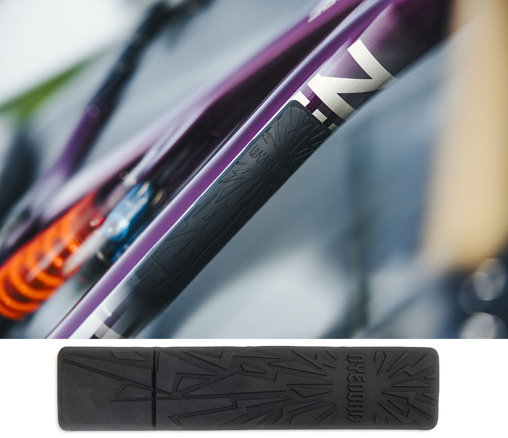 DYEDBRO シュッシュ ダウンチューブプロテクターは、ピックアップトラックのテールゲートパッド、ストラップ、隣の自転車との繰り返し接触によって生じる擦り傷、微細な傷、へこみからフレームをしっかりとガード。シャトル走行を何マイルも繰り返しても、塗装の状態を保ち、ダウンチューブ形状を維持する。強力な 3M™製粘着シートを使用し、素早く確実な取り付けが可能。あらゆるメーカー、モデル、フレームサイズのマウンテンバイクに対応する。
